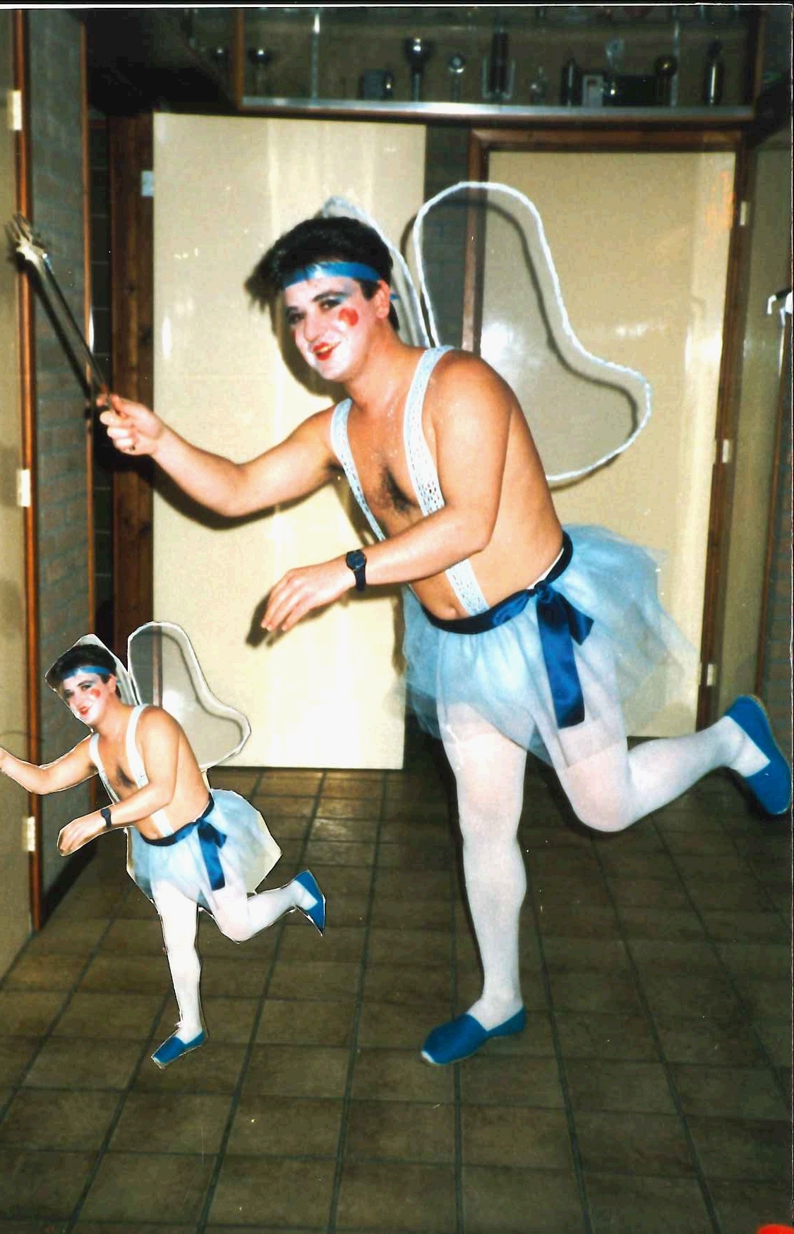 Het moet gezegd worden, ik zag er fantastisch uit met mijn stoere vleugels van tule en ijzerdraad. Mijn ontblote bovenlijf, mannelijk bespoten met glitter. Een robuust kort, blauw, tulen rokje boven een paar heldhaftige witte panties. Ja, als 11-je kreeg ik een dikke 10! Maar die vleugels…